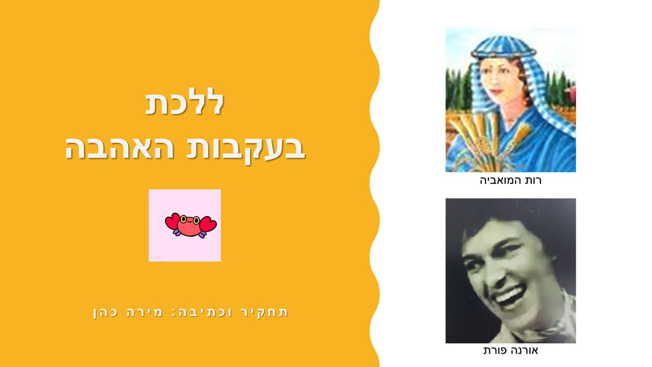 סיפורן של רות המואביה ואורנה פורת ללכת בעקבות האהבה – סיפורן של רות המואביה ואורנה פורת מה הקשר בין רות המואביה ואורנה פורת? על איזה סיפור אהבה מדובר? איך זה קשור לחג שבועות? זהו סיפורן של שתי נשים פורצות דרך…