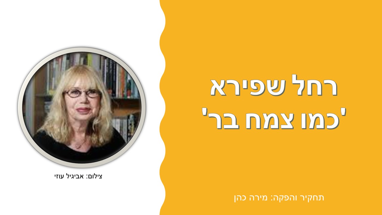 רחל שפירא כמו צמח בר רחל שפירא מוכרת לציבור בזכות שיריה המרגשים, המשקפים אהבה לארץ ישראל, לנופיה ולערכיה השיתופיים. היא מצליחה לזקק חוויות לאומיות כאובות ורב־ממדיות למילה אחת מדויקת, וכדבריה – "לברוא יופי מתוך הקושי".ביצירתה הענפה היא פורטת בעדינות וברגישות…